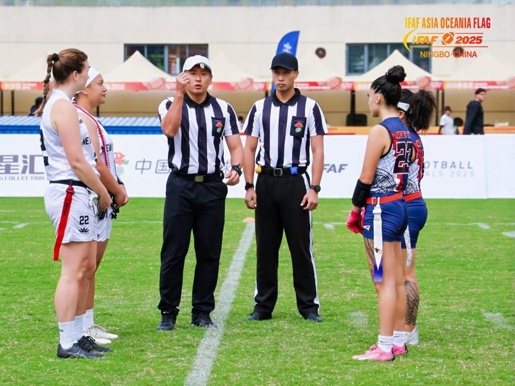 Featured Picture: Amerika Samoa Women’s National Flag Football Team Captains at the coin toss against Aotearoa during the 2025 IFAF Asia Oceania Flag Football Championships in Ningbo, China.